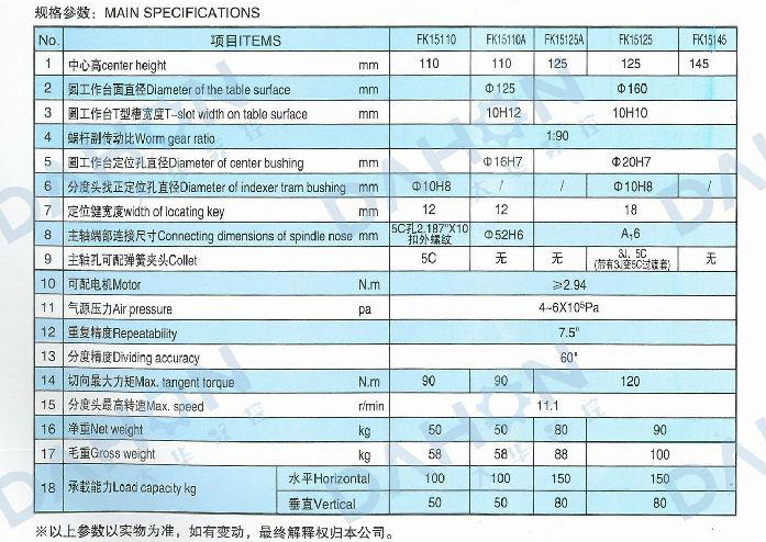 FK15系列數(shù)控立臥分度盤是數(shù)控銑床、加工中心等機(jī)床的主要附件之一,亦可作為半自動(dòng)銑床、鏜床或其他類機(jī)床的主要附件。Connected with the CNC control device or the contro system of the machine and the 4-6 bar pressure air,the NC dividing head can carry out the performance of clamping, unclamping and circular indexing at arbitrary angle for the work-piece.this product can be used vertically and horizontally.